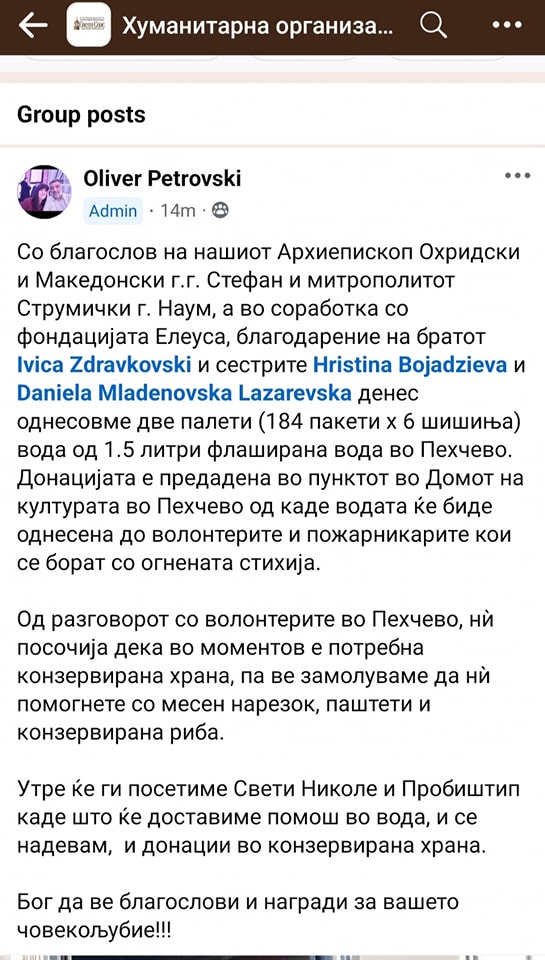 Фондација Елеуса се вклучи во акцијата за помош на волонтерите и пожарникарите кои се борат со огнената стихија во Пехчево во координација со Хуманитарната организација ,,Свети Спас” со благослов на Архиепископот Охридски и Македонски г.г. Стефан и Митрополитот Струмички г. Наум. Во акцијата се вклучија и хумани граѓани.